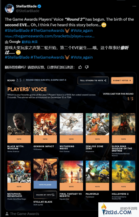 备受玩家们喜爱的动作冒险游戏《剑星》也成功晋级到第二轮中,游戏官方在推特发文拉票:“游戏大奖玩家之声第二轮开始!第二个EVE诞生……哦,这个故事好像听过…… ”