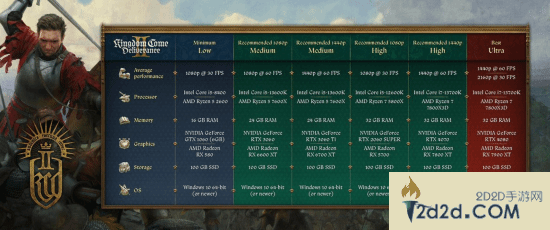 就在今日,开发商Warhorse Studios公布了《天国:拯救2》的PC配置需求。从图中可以看到,本作最低配置仅需显卡:NVIDIA GeForce GTX 1060 (6GB)/AMD Radeon RX 580,处理器:Intel Core i5-8400/AMD Ryzen 5 2600,需要预留100GB可用空间。