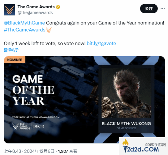 与此同时,TGA官推再发《黑神话》TGA年度最佳投票帖,再次祝贺的同时提醒各位玩家投票时间仅剩一周,抓紧投票!
