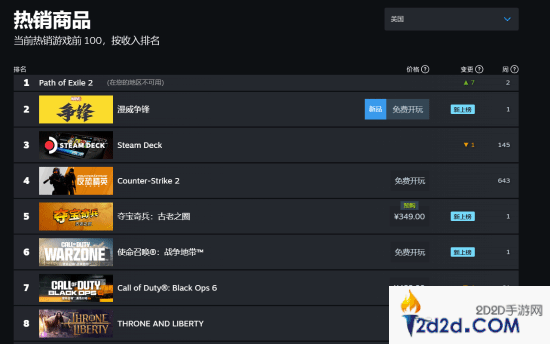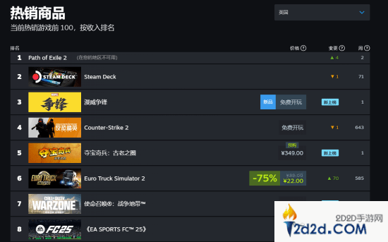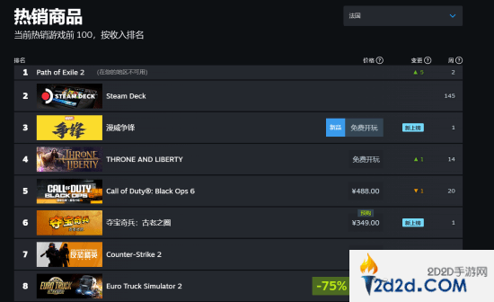 此外,本游戏在美国、加拿大等国家的收入榜上同样排在第二位,仅次于今日刚刚发布的《流放之路2》;而英国、法国等国家的《漫威争锋》则排在第三位。