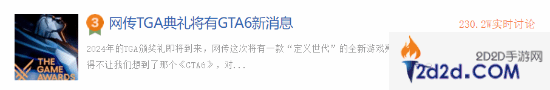 这个消息引发了玩家们的热议,大家纷纷猜测,能配得上"划时代"这个词的游戏,似乎只有《GTA6》了。截止至发稿时,话题“网传TGA典礼将有GTA6新消息”登上贴吧热议榜第三位。