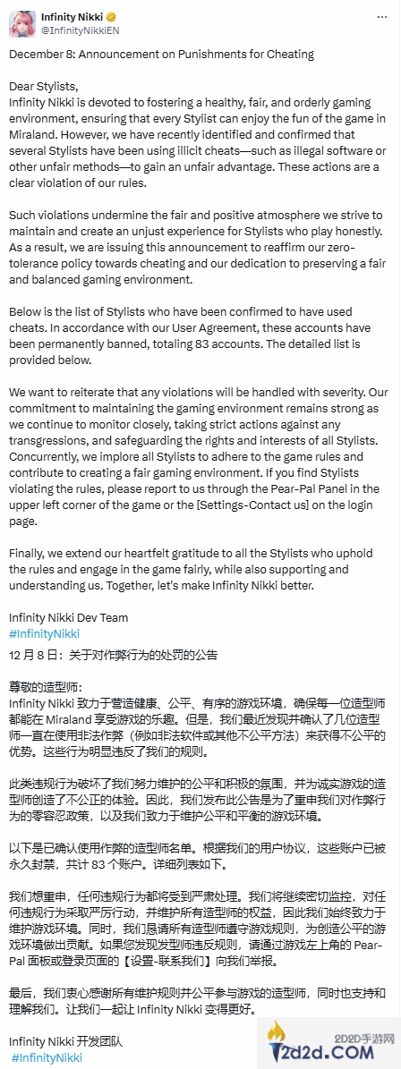 根据叠纸游戏的报告,已有83个作弊账号被永久封禁。开发商强调,任何违反规则的行为都将严惩不贷。