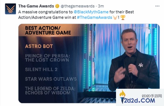 在TGA推特账号发文中,官方“手滑”将奖项颁发给了《黑神话:悟空》。