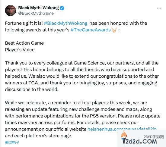 在2024年TGA(The Game Awards)颁奖典礼上,《黑神话:悟空》表现亮眼,一举斩获“最佳动作游戏”和“玩家之声”两项重量级奖项。颁奖礼结束后,《黑神话:悟空》官方在外网发布感言,表达了对玩家、团队和合作伙伴的感谢。
