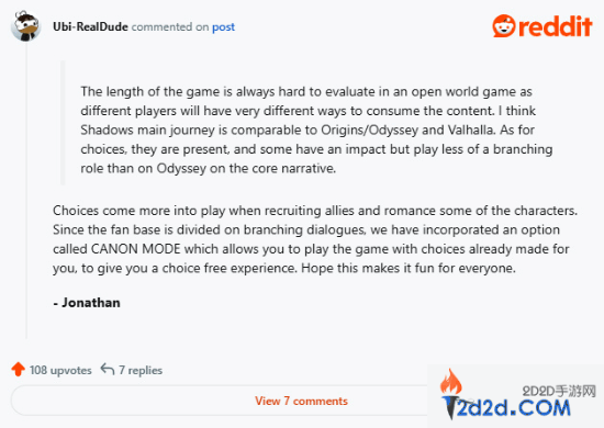 近日,在Reddit论坛,《刺客信条:影》开发团队主创透露,游戏将推出经典模式功能,该模式旨在解决玩家选择焦虑,系统会自动为玩家选择“默认”的对话选项,无需玩家费心权衡利弊,只需安心享受剧情的推进。