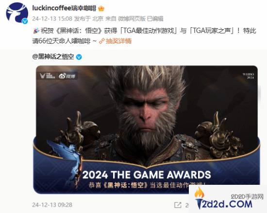 瑞幸咖啡发文祝贺《黑神话:悟空》获得“TGA最佳动作游戏”和“TGA玩家之声”,转发抽取66位天命人免费喝咖啡。
