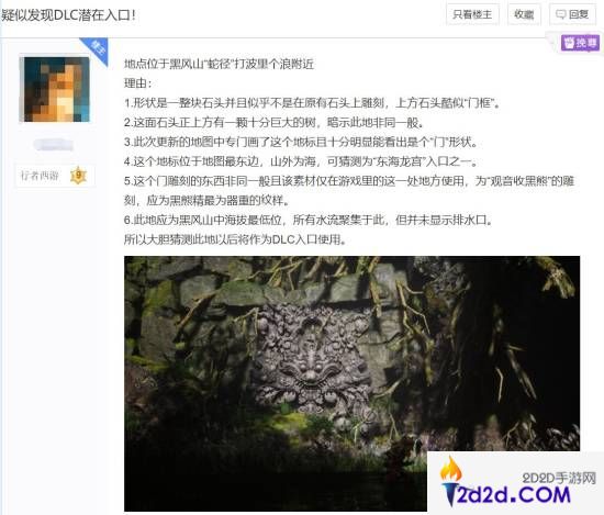 今日有贴吧网友发帖,他发现《黑神话:悟空》疑似DLC内容的潜在入口,位置在黑风山“蛇径”打波里个浪附近。并且他给出了六条简明却有力的分析,虽是猜测但有理有据,让人为之敬佩。尤其是《黑神话》最近的版本更新了地图功能,这个位置有明显的标记。