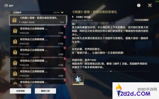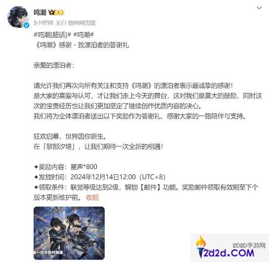 《鸣潮》官方今日发布致漂泊者的答谢礼,感谢漂泊者们的关注和支持,并向全服玩家发放800星声的奖励。值得一提的是,《鸣潮》此前已经发放了TGA提名的800星声,这次虽然没能拿奖,但还是追加了一波奖励。