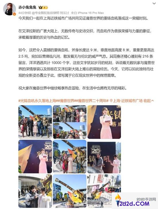 如今,这把令人震撼的重铸血吼,斧身长度达 9 米,垂直地面高度 8 米,重量更是高达 2.5 吨,宛如巨兽降临凡间,散发着无与伦比的威严气息。其周身还精心雕刻有 216 条留言,洋洋洒洒共计 10000 个字,这些文字犹如岁月的铭刻,诉说着无数玩家与魔兽世界的深情厚谊以及那些在艾泽拉斯大陆上难忘的冒险经历。今天,它将以如此独特而壮观的全新姿态矗立于此,续写属于它在现实世界中的辉煌篇章。