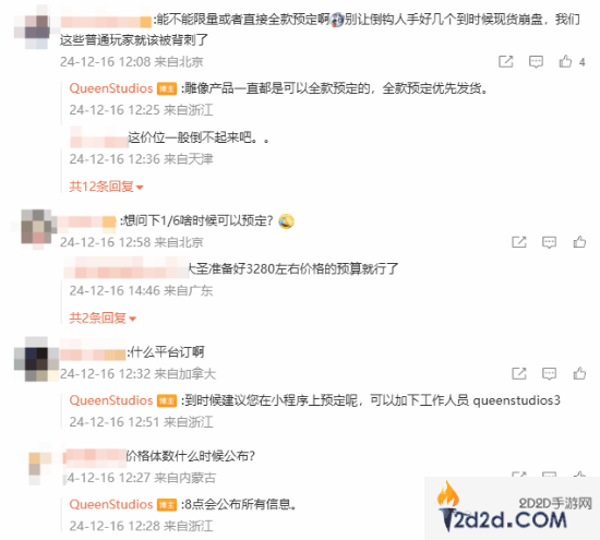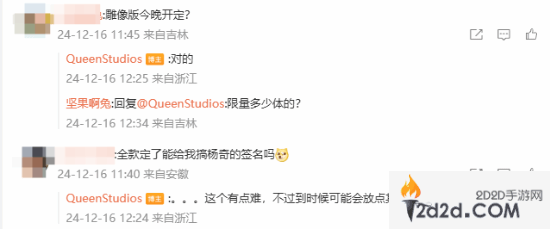 有玩家担心黄牛,表示:“能不能限量或者直接全款预定啊,别让倒钩人手好几个到时候现货崩盘,我们这些普通玩家就该被背刺了。”QueenStudios官方称:“雕像产品一直都是可以全款预定的,全款预定优先发货。”还有玩家调侃:“全款定了能给我搞杨奇的签名吗?”QueenStudios官方表示:“这个有点难,不过到时候可能会放点其他的。”