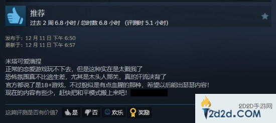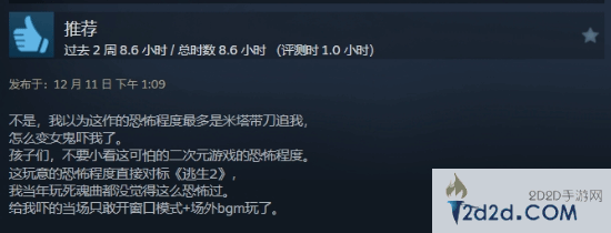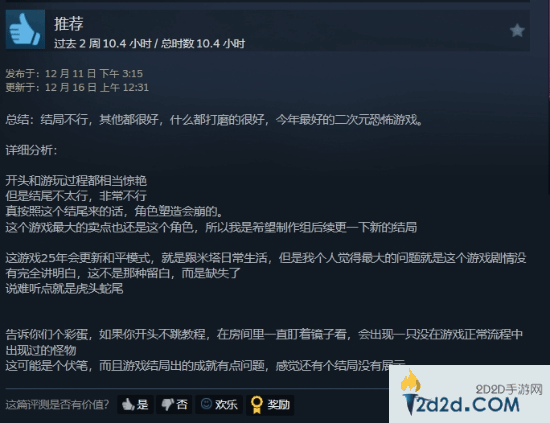 有网友表示,这是近年来很有想法和创意的一款心灵恐怖游戏,甚至有玩家警告后来者:“这玩意的恐怖程度直接对标《逃生2》”。不过也有部分玩家表示,虽然游戏的各方面都不错,但结局却有些不尽如人意。